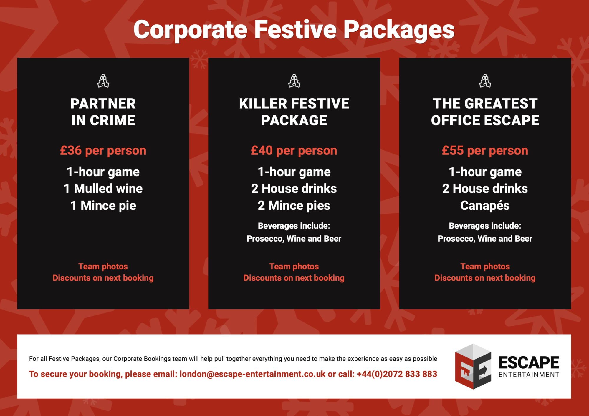 Think epic Christmas food and drinks with all the escape room game excitement you can handle! Take a look at our packages on offer to add to your booking or get in contact with us to find out more.